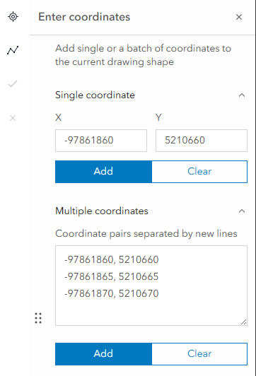 Coordinate entry allows a user to stipulate either one or multiple coordinate pairs to construct a feature. It is also possible in the builder to allow a user to choose from multiple coordinate systems. Multiple coordinates must be entered in the form X,Y separated on new lines and can not be used with point features.