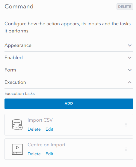 // Take the file import from the Command Form var source = $action.csvfile // Convert the data file into a FeatureSet using the csvtolayer function // Need to state what the fields are we are expecting to see and that the spatial reference of the CSV is 4326. // It will automatically get projected to the map's spatial reference var myfeatureset = csvtolayer(source.data, [ { "name": "name", "type": "string", "sourcename": source.fields.name } ], { type: "point", "xfield": source.fields.X, "yfield": source.fields.Y, spatialReference: { wkid: 4326 } }); // Now build up an array of features to insert var feats = []; var mp = []; var g = null; for (var feat in myfeatureset) { g = geometry(feat); if (g != null) { push(mp, geometry(feat)); push(feats, Feature(geometry(feat), { "Name": feat.Name })); } } // For convenience, create a multipoint of all the points // to get the extent. We will use this to zoom to the extent if (count(mp) > 0) { var allpts = MultiPoint({ points: mp, spatialReference: mp[0].spatialReference }); // Use the state function to store this extent, just for the duration // of the operation. We will use this in the next task to // zoom to the extent state("lastimportextent", extent(allpts), { "type": "operation" }); } else { state("lastimportextent", null, { "type": "operation" }); } // Return the array to insert return feats - To centre the map on the imported features, one could create another Execution task with the Run Actions option with the following script noting that the order of Execution tasks in the Command panel needs to be followed.