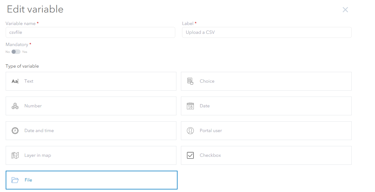 - Execution tasks can be setup in the Command panel to perform actions upon uploading of a file. For example, it is possible to take an imported CSV file and convert it into a FeatureSet with the following Arcade script.